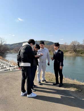 宇治川の河川敷でドローンの飛行練習をしました。川の流れの写真をもとに、流速を計算するAI技術を用いた研究に応用します。3月上旬ですが、とても寒い日でした。花粉がすごかったです。(伊藤)